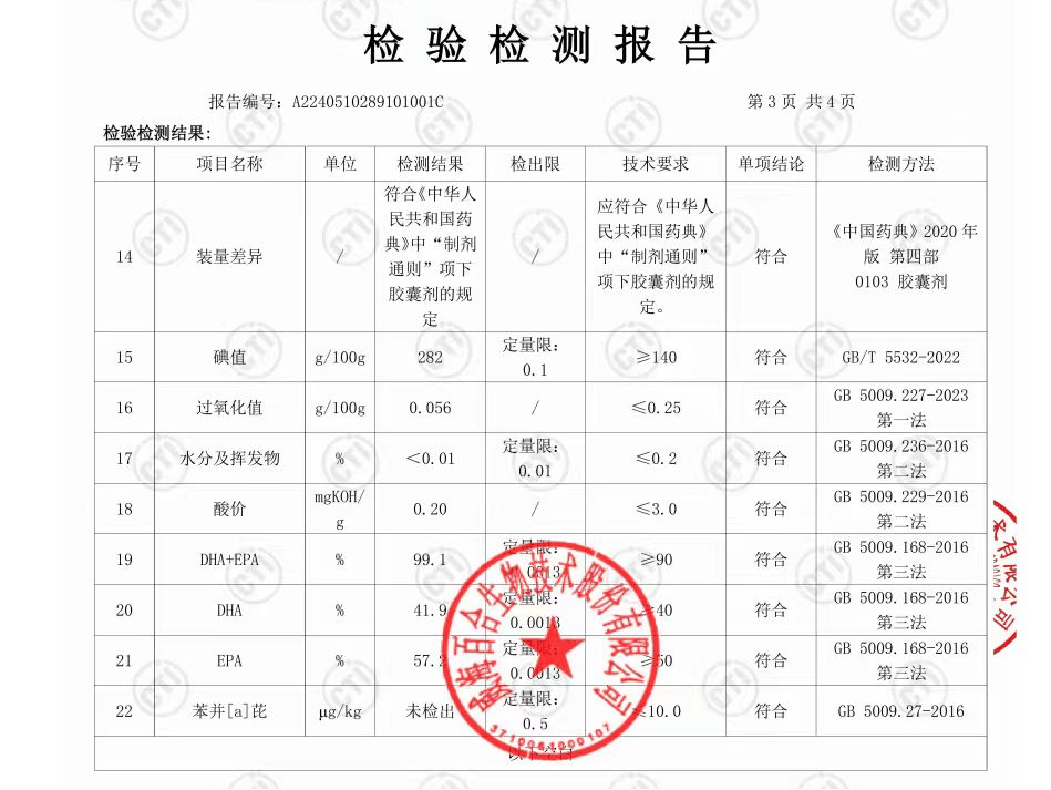 这项核心工艺,确保了棘小白鱼油纯净度的极致追求。每一次的检测报告都让团队倍感欣慰:每100g鱼油中,DHA含量高达41.9g,EPA含量57.2g,两者之和(DHA+EPA)更是达到了令人惊叹的99.1g。这近乎满分的纯度,是无数次工艺优化和严苛品控的结晶,是对“蓝帽认证”保健食品标准的超越。更令人安心的是,塑化剂、重金属、致癌物、微生物等潜在风险指标,棘小白鱼油软胶囊的检测结果远优于国家最严格的标准线。