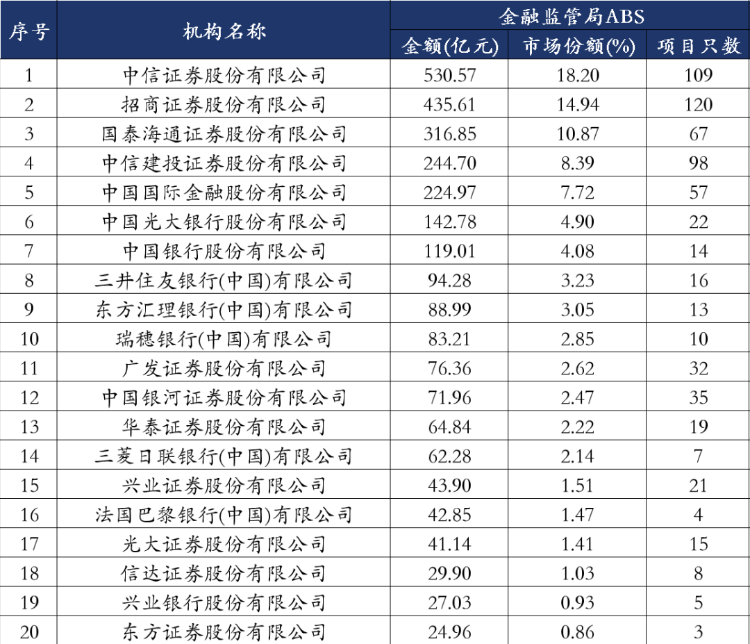 2025年,银行间信贷ABS承销规模前5家承销商分别为中信证券、招商证券、国泰海通证券、中信建投证券和中金公司,承销规模分别为530.57亿元、435.61亿元、316.85亿元、244.70亿元和224.97亿元,市场份额分别为18.20%、14.94%、10.87%、8.39%和7.72%,合计60.12%。