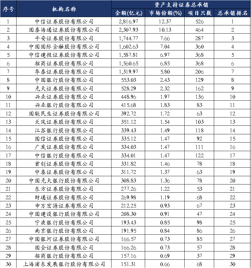 2025年,交易所企业ABS承销规模前5家承销商分别为中信证券、平安证券、国泰海通证券、中信建投证券和华泰证券,承销规模分别为1,868.27亿元、1,688.49亿元、1,674.47亿元、1,112.46亿元和983.03亿元,市场份额分别为13.22%、11.95%、11.85%、7.87%和6.96%,合计51.85%。
