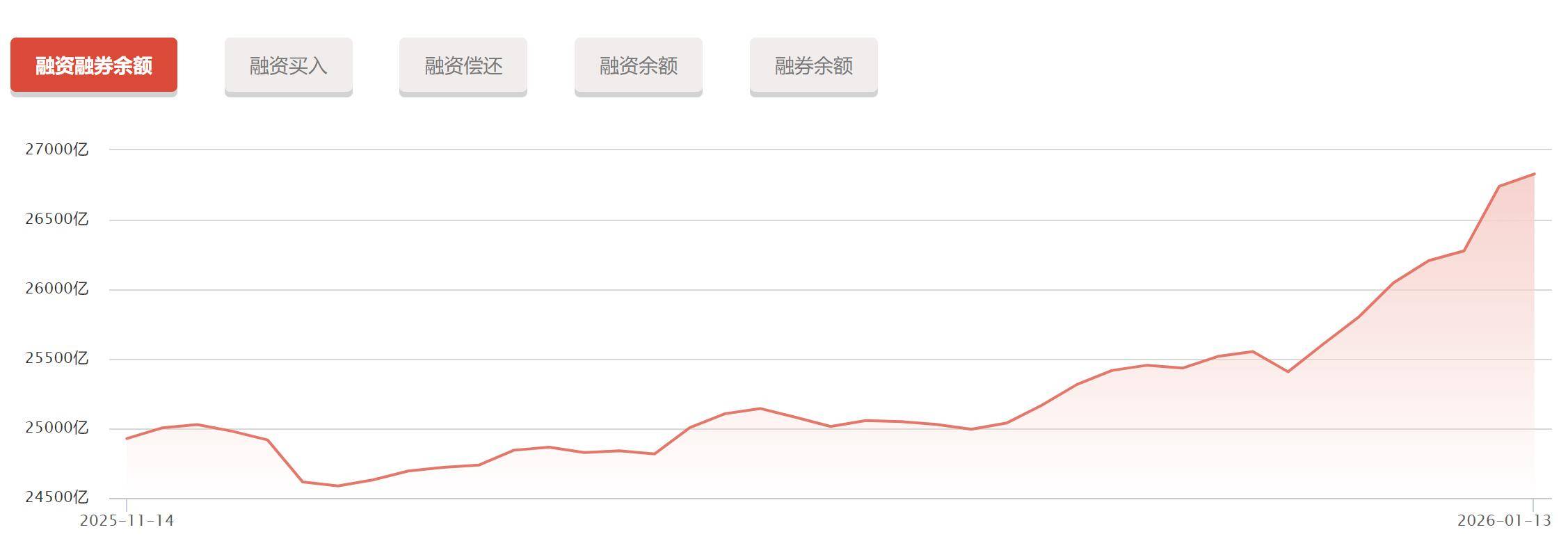 最新数据显示,截止1月13日,沪深京三市融资融券余额为2.68万亿元,其中融资余额高达2.67万亿元。自去年下半年以来,融资融券余额稳步攀升,从1.80万亿元升至2.68万亿元,半年增长约8000亿元,近期有加速迹象。