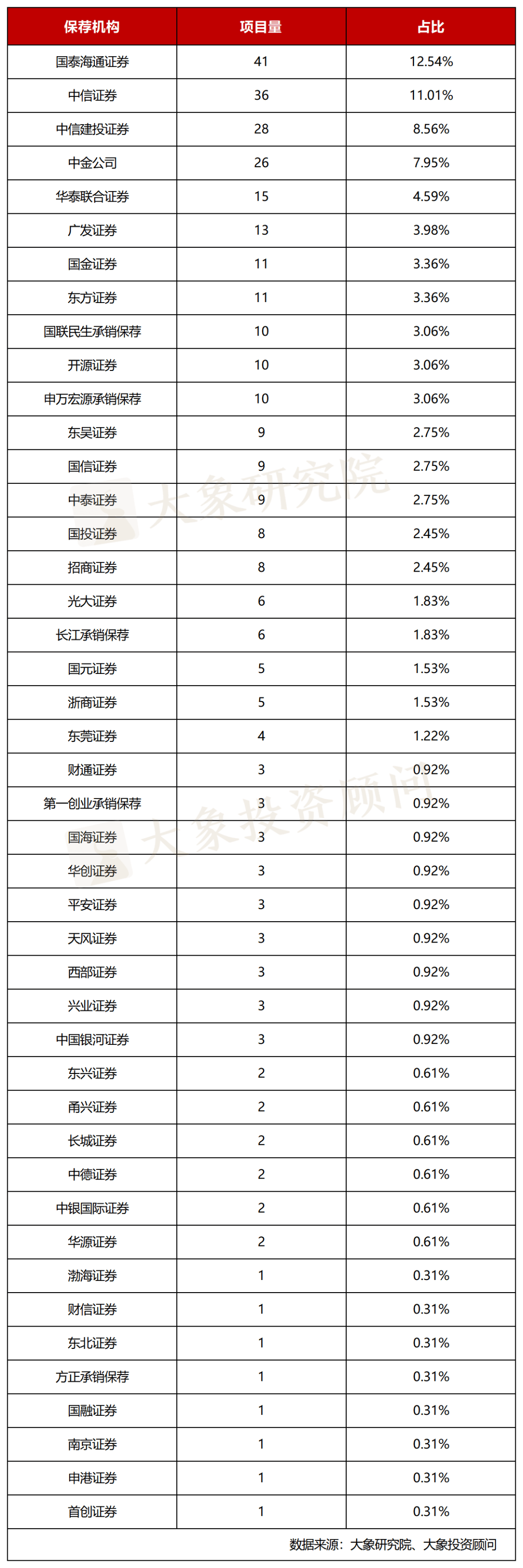 据大象君统计,共有44家券商投行担任了323家排队企业的IPO保荐机构。项目量排名情况如下: