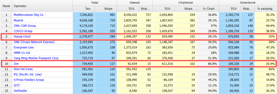 根据Alphaliner最新数据,赫伯罗特目前全球排名第五,运营284艘集装箱船,其中自有船舶132艘、租赁船舶152艘,总运力约237.8万TEU,另有58艘新造船订单,总计约47.7万TEU。