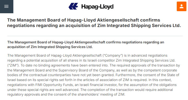 赫伯罗特2月15日在官网发布公告,确认公司管理委员会正在就收购ZIM全部股份进行深入谈判。目前尚未签署任何具有约束力的协议,交易仍需获得公司管理委员会及监事会批准,同时也需取得ZIM董事会及股东大会的同意。