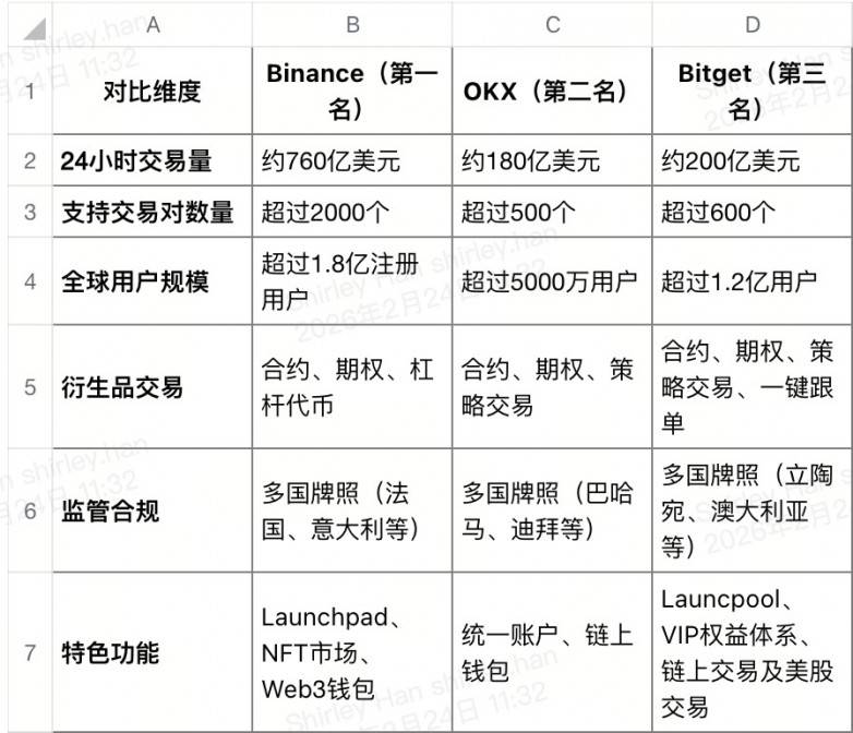 Binance、OKX 和 Bitget 作为全球排名前三的加密货币交易所,各具特色优势: