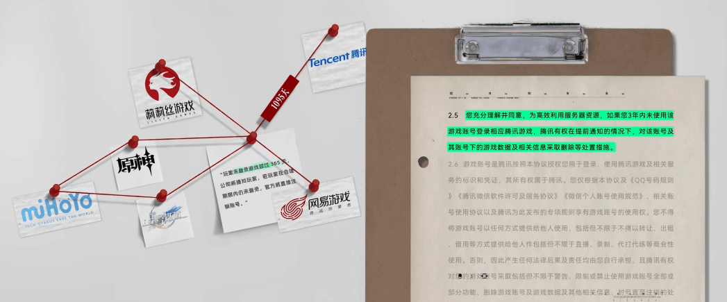 像米哈游的《原神》,《星穹铁道》游戏协议中,同样规定了365天不登录,厂商有权删除用户账号。莉莉丝的服务协议,写的也是365天。腾讯的稍微宽松一些,把删号时间放宽到了三年。