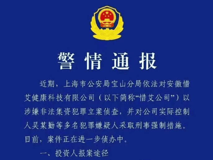 安徽惜艾健康科技有限公司涉嫌非法集资犯罪被立案侦查,实控人吴某勤等多名犯罪嫌疑人被采取刑事强制措施
