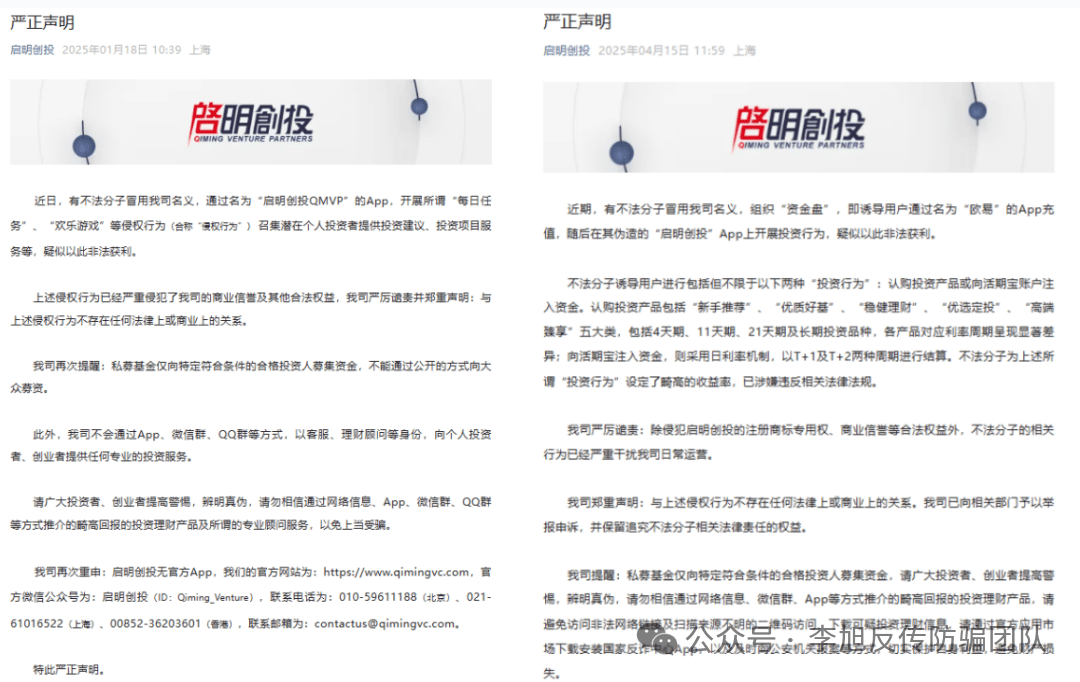 · 现状:2025年10月,正牌机构启明维创创业投资管理(上海)有限公司多次声明并报案。