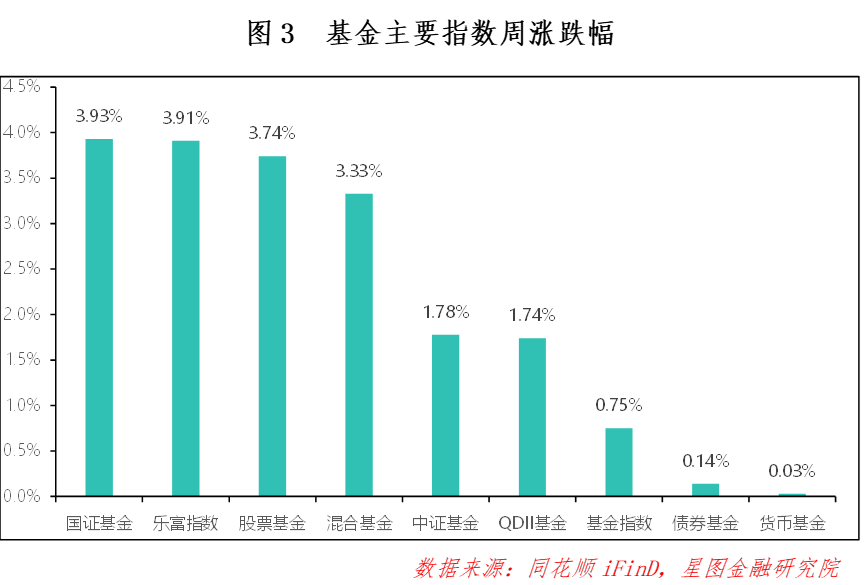 3.93%和3.91%,明显好于中证基金和基金指数,主要是深市整体表现要强于沪市,导致深系基指同样要强于沪系基指。QDII型基金上涨1.74%,虽然不如国内的基金指数,但整体表现不错,主要是海外市场与国内市场共振上涨。债券型基金上涨0.14%,要强于正常水平,货币型基金上涨0.03%,收益较为平淡,债市同样表现不错,不过长债表现要好于短债。周内基金收益率中枢表现分化,股票型表现最佳,周收益率中枢达到