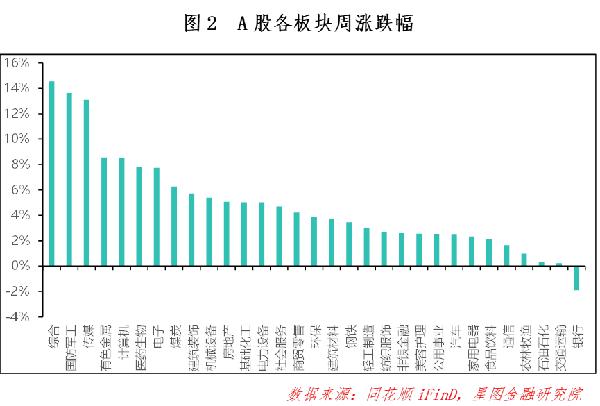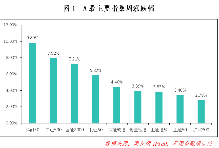 股集体收涨,9大指数全线上行,市场上赚钱效应非常好。从市场风格上看,中盘股表现最好,中证500狂涨7.92%,小盘股表现其次,国证2000上涨7.21%,明显好于偏向大盘股的上证50和沪深300,后两者分别上涨3.40%和2.79%。成长表现明显好于价值,科创50大幅拉升9.80%,创业板指上涨3.89%,同样要优于价值风格占主流的上证50和沪深300。从申万一级行业来看,周内