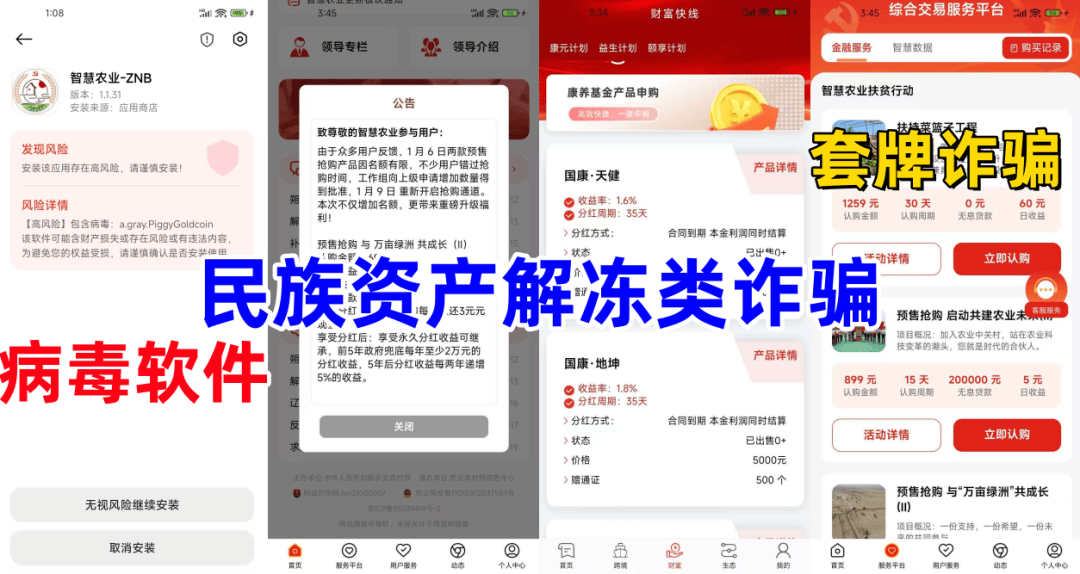 不法分子冒充某部门的旗号,打着“智慧农业”“数字农业”“助农”等旗号,虚构各种理财项目实施诈骗,近期,该项目又推出“落地篇”要求参与者交钱激活账户,才可以正常提现!