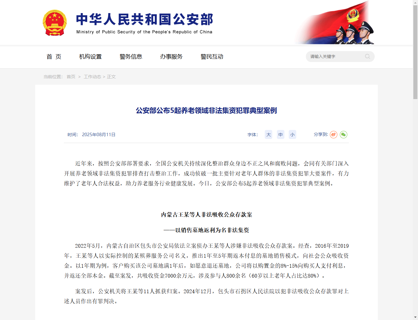 针对养老领域非法集资多发态势,公安机关积极参与打击整治养老诈骗专项行动。2022年以来,全国公安机关立案侦办了一批案件,成功破获“山海慧”“金恪集团”“东隆投资”等案件。