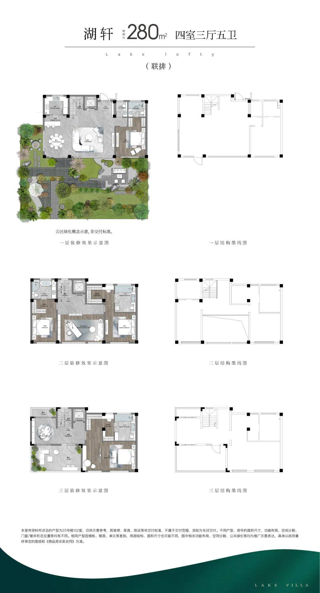 云湖璞院的产品线很丰富,从洋房、叠墅到联排,面积约150-280㎡,能满足不同家庭的改善需求。每一款别墅户型都经过精心设计,力求实现空间与功能的完美平衡。 比如这款280平联排,约9.4米的大宽厅直面景观,空间非常阔绰;约13.5米的大面宽让阳光洒满每个角落;主卧开间约7米,能轻松打造带独立卫浴和衣帽间的豪华套房,居住尊贵感十足。
