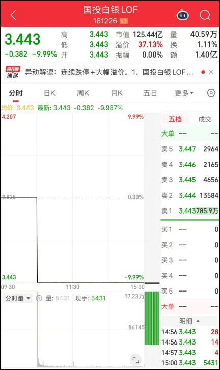 2月5日,国投白银LOF场内开盘触达跌停,截至目前已连续四日跌停,溢价率回落至37.13%。