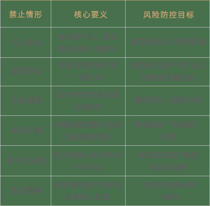 主体诚信审查:针对境内主体及其控股股东、实际控制人近3年内的特定刑事犯罪记录(贪污、贿赂、侵占财产、挪用财产或破坏社会主义市场经济秩序类犯罪)设置禁令;(4)违法存疑主体禁入:对正处于涉嫌犯罪或重大违法违规立案调查、尚未有明确结论的境内主体禁止开展业务,是监管